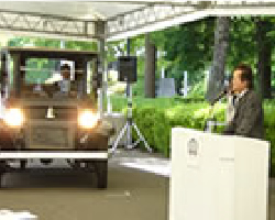 1917年、米国より輸入された電気自動車で、輸入された5台のうち2台の「デトロイト号」は、日本電池(現GSユアサ)初代社長・島津源蔵氏が所有。自社製(GS製)の蓄電池を積み込んで走行するなど、「源蔵さんのシルクハット」と呼ばれ、人々に親しまれた車です。2008年(平成20年)8月、GSユアサ様の本社社屋を出発し、京栄ニチユ本社へ到着。緊迫した緊張感の中、トラックからゆっくりと積み下ろしされ、その姿を現しました。